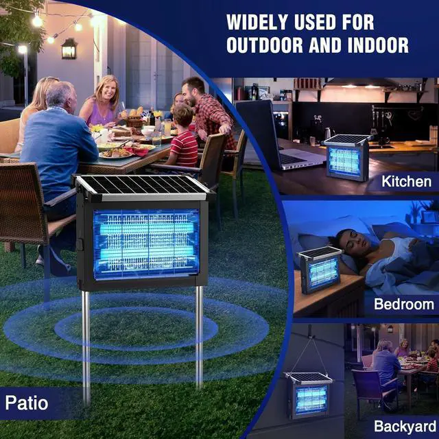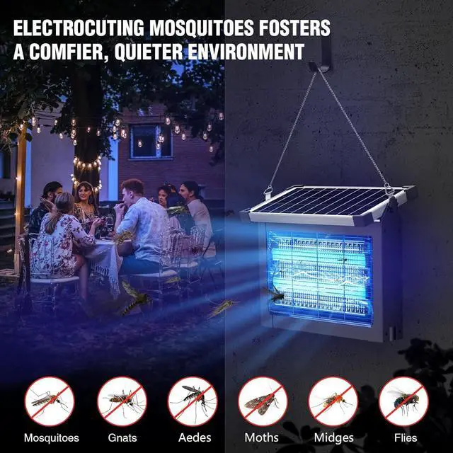 Portable and Easy to Use: Made from high-quality ABS materials, the solar insect zapper includes an 2.6 ft hanging chain and a 10ft solar panel extension cable, suitable for both indoor and outdoor use. It can stand alone, be hung on a wall with the chain, or be staked into the ground. The insect killer is widely used in homes, kitchens, living rooms, bathrooms, decks, pool areas, garages, hotels, RVs, restaurants, barns, porches, backyards, courtyards, lawns, gardens, etc.