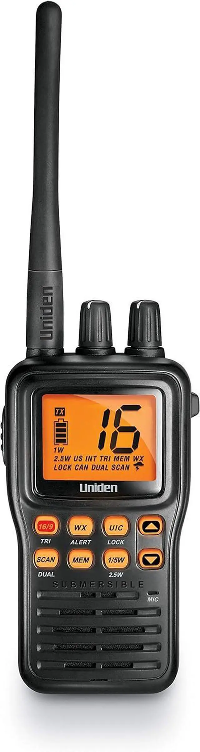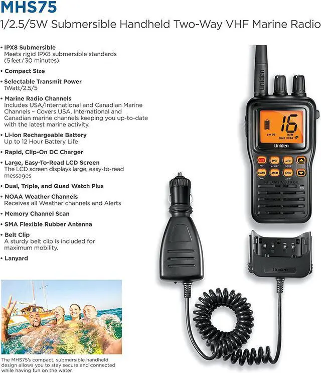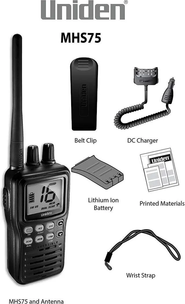This compact, well built, rugged handheld Marine radio is rated JIS8/IPX8 submersible and is packed with outstanding features. Included accessories are a rapid clip-on DC charger, and Lithium-Ion rechargeable battery. SMA Flexible Rubber Antenna. Belt Clip - A sturdy belt clip is included for maximum mobility.