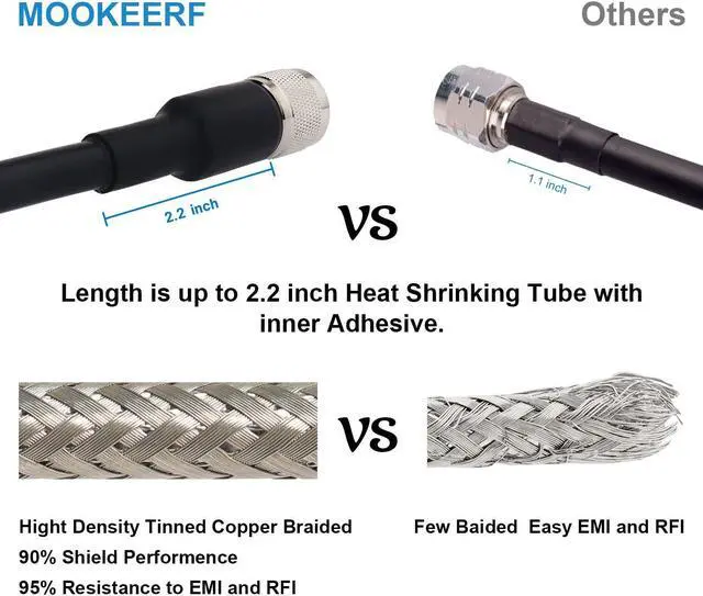 Prevent Coming Off-Connection between UHF male connector and kmr400 coaxial cable end is equipped with a 2.2" heat shrink tube and built with adhesive, which is longer than ordinary cables. It could support professionally connection between cable and adapters and prevent connector to pull out.