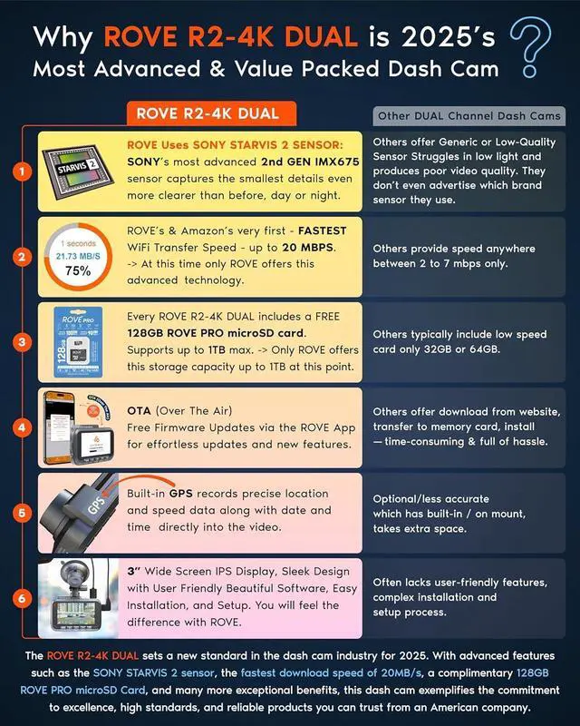 ULTRA FAST 5G WIFI/ UP TO 20MB/s DOWNLOAD SPEED With its built-in dual-band 5GHz and 2.4GH z WiFi, you can use the ROVE dash cam app to view and manage dash cam recordings instantly on your iPhone and Android smartphone. By using the ROVE app, download your recorded videos directly to your smartphone at a speed of up to 20 MB/sec and then easily share these on social media with friends and family. Additionally, manage camera settings and update the latest firmware over-the-air via the ROVE App.