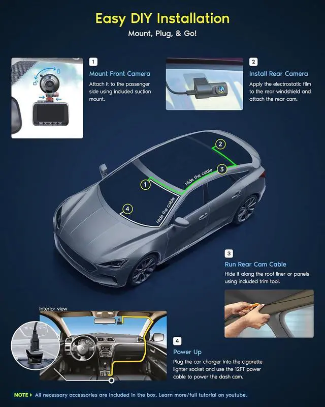 FEATURES WITH STATE-OF-THE-ART TECHNOLOGY INCLUDED Experience peace of mind with this front and rear car dash cam. It comes with a free 128GB microSD card and offers advanced features such as an f 1.5 aperture, motion detection, G-sensor, seamless loop recording, emergency video lock, screen saver, live speed and compass direction, voice guidance, ring of threads for optional CPL filter, a built-in supercapacitor for extended product life, support for up to 1TB microSD cards, and many more.