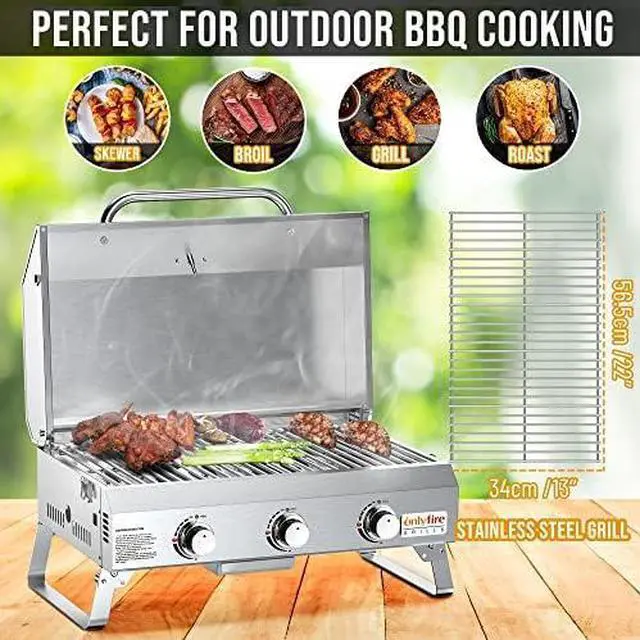 - PREMIUM HEAVY DUTY STAINLESS STEEL CONSTRUCTION: The Onlyfire portable gas grill is made of high quality stainless steel to ensure duarability and longlife use. The 286 square inches stainless steel cooking grate allows you to enjoy delicious grilled food no matter where you are. Perfect for camping, tailgating, picnics, RV trip and backyard BBQ gathering.