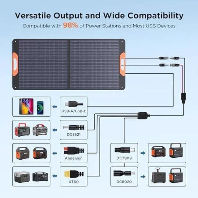 - Versatile Output and Wide Compatibility: 100W foldable solar panel comes with a controller which is equipped with 3 versatile interfaces to meet all your charging needs. The solar interface can seamlessly connect to our complimentary 10ft 4-in-1 solar cable (XT60/ANDERSON/DC5521/DC7909), ensuring compatibility with the majority of outdoor power station available in the market; 1*Black USB-A(5V/3A), 1*orange USB-A(12V/ 1.5A )&1*Type-C(20V/3A)can charge USB devices like phones, tablets, laptops etc
