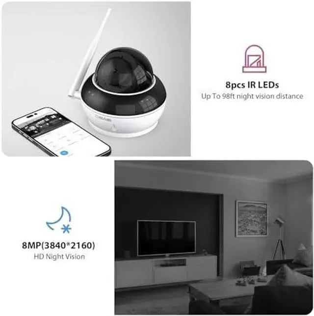 - Infrared Night vision & 2-Way Audio: This Wireless IP Dome Camera has 8 built-in infrared lights and supports 8MP HD infrared night vision. The night vision distance of the Wireless IP Dome Camera can reach up to 98 feet. And this Wireless IP Dome Camera has microphone and speaker, so it supports two-way audio. You can communicate with the people who in front of the Wireless IP Dome Camera or eliminate danger by making a sound. And you can also hear audio in the video recorded by SD card.