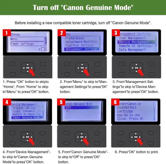 No OEM: If your printer appears Canon Genuine Mode, please close this mode as follow step: Menue > Management Settings > Device Management > Canon Genuine Mode > Off. You install the replacement toner after you closed Canon Genuine mode, your printer may be appears a remindernon Canon Cartridge is possibly inserted, only pressOKkey, the toner could work.
