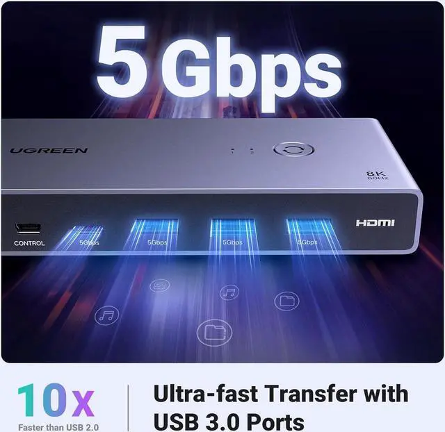 - With 4 USB 3.0 Ports: This HDMI KVM switch has 3 USB 3.0 ports and 1 USB-C port for sharing USB flash drives, printers, mobile hard drives, U disk, and other USB 2.0 and USB 3.0 devices. USB 3.0 offers data transfer speeds of up to 5Gbps, while USB 2.0 only 480Mbps. It allows faster file and picture transfer to make work and life more convenient.