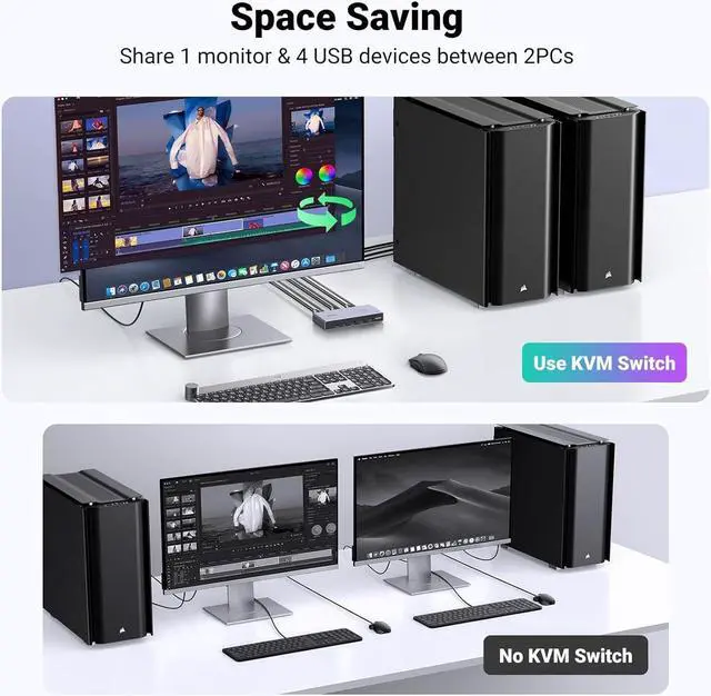 - Two Switching Ways: By One-Botton switch or desktop controller, freely switch between 2 computers, saving space on your desk and sharing your display, keyboard and mouse between both computers. When the USB switch is not placed on the desktop, the controller will be a good helper for you to quickly switch.