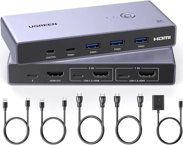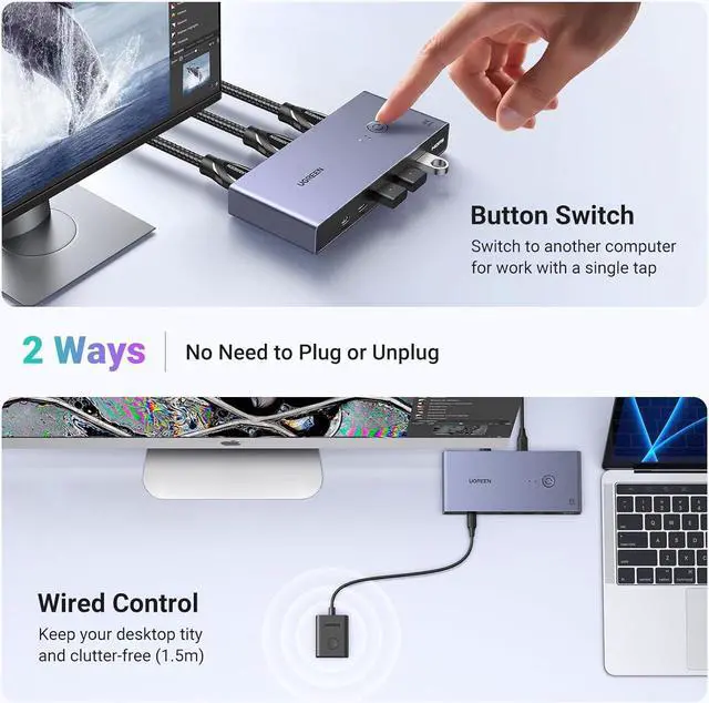 - Upgraded Resolution UHD 8K@60Hz: This HDMI 2.1 2 port KVM switches supports resolution up to 8K@60Hz and backward compatible 4k@60Hz, 4k@30Hz, 2560*1440@120Hz, 1920*1080@240Hz. UGREEN USB Switch also supports HDMI 2.0 / 1.4 and HDCP 2.3 / 1.4.
