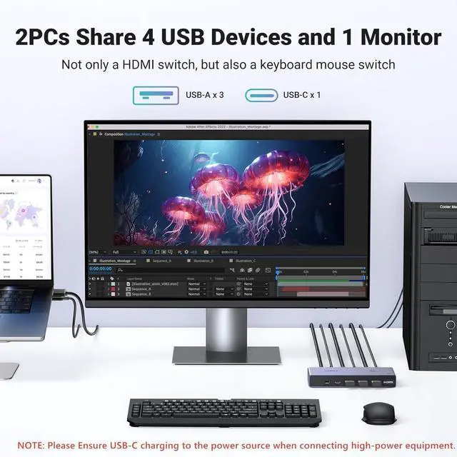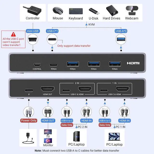 NOTE: 1, USB C power cable or power adapter is NOT INCLUDED. 2, Please ensure that the resolution of the two devices at the input and the device at the output is consistent, and the HDMI cable connected to the monitor also needs to support 8K resolution. 3, Not support hotkey switching and EDID emulation. 4, Not supported for use with docking stati