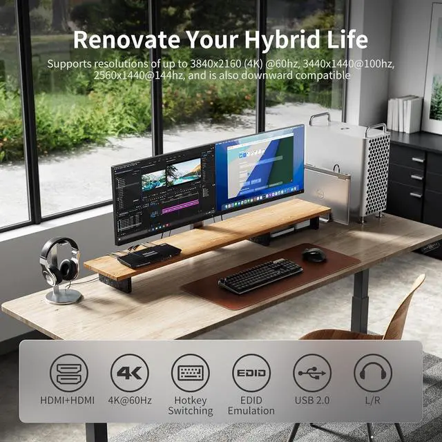 Emulators: With EDID emulators in each input port, your computers always receive the correct display informationensuring maximum compatibility and preventing issues like flickering, resolution mismatch, or no signafalseEasy Switching OptionsHDMI 2 monitor KVM lets you switch between sources via HotkeysFront panel buttonIR Remote (AAA batteries not included) no more swapping HDMI cables. Simplify your desktop setup across PCs, laptops, consoles, and streaming devicesfalse- 2 (HDMI+HDMI+USB-B) Inputs & 2 HDMI OutputsSeamlessly access 2 desktops or laptops using 2 monitors and one set of keyboard and mouse. Easily set up dual-monitor display per system, or split display across both systems (one on each monitor), while toggling your keyboard and mouse control. Need to monitor system A while working on system B? Just press Scroll Scroll 3, then double-tap Right Alt done!
