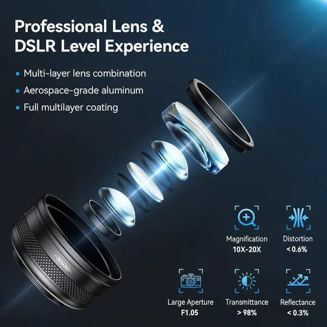 - 10-20X Precision ZoomAdopting ultra-precise rotating telescopic lens structure, it can realize 10-20X smooth zoom, enjoying the same operation experience as a DSLR camera and better capturing the details of the subject. Supports 0.6 -inch ultra-close-up shooting to capture complex details more clearly. Super high image clarity, designed for macro photography enthusiasts, for cell phone still life close-ups on insects and plants, nail art and beauty details, jewelry, food, figure models and other small objects