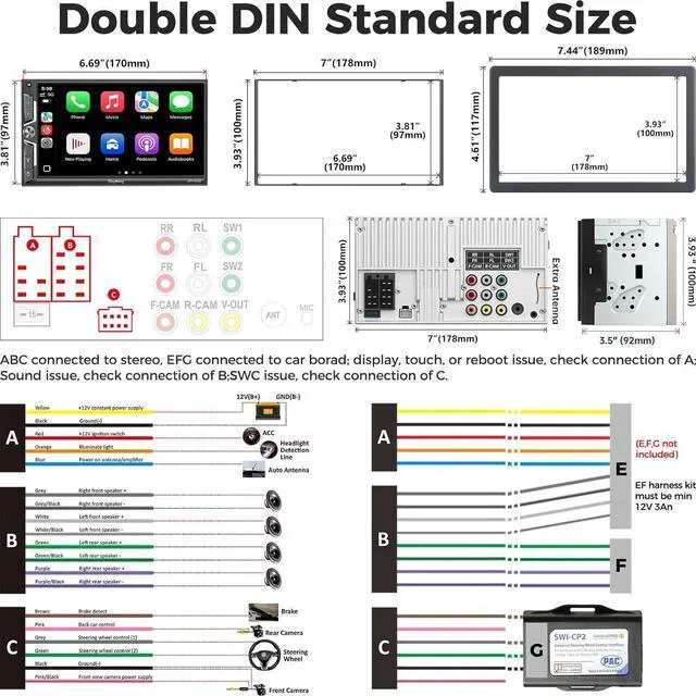 - Important Tips: Standard size 170mm*97mm. Please make sure your dash board opening size fits our car stereo. If our stereo size does not meet your dash size, you would need to purchase an additional suitable dash kit; Please read the instructions before installation; Some cars may also require two additional after accessories to complete the installation: Wire harness adapter and radio antenna adapter for your car model. (WIFI connection means that the unit and the mobile phone connect via WIFI. It does not support WIFI hotspot connection)