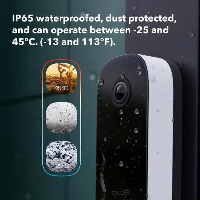 Industry-leading, head-to-toe field of view. Expansive 175° vertical and 187° diagonal field of view allows for a closer view of visitors or packages right up against at your doorfalseSnapshots of who's at your door are stored and viewed through the ecobee app for up to 30 days. *Video storage required ecobee Smart Security subscriptionfalseUnlock 24/7 professional monitoring, 30 day video storage, package detection, and rich notifications with a snapshot of who is at your door with an ecobee Smart Security subscription. Register your doorbell camera and automatically get one free monthfalseThe ecobee Smart Doorbell Camera (wired) sees what others cant by letting you see more of whats really happening at your door, day or night.