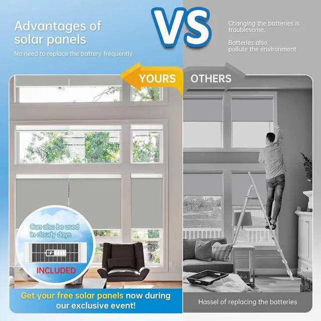 Advantages: As motorized blinds, they don't require frequent battery changes because they are rechargeable. Additionally, they don't need frequent charging as they are powered by a complimentary Solar Panel. The automatic blinds for windows runs very quietly, so you don't have to worry about disturbing the baby in the nursery. Remote control blinds are easy to control, saving time. Don't worry about not having the size you need, we can customize the size. false-Free