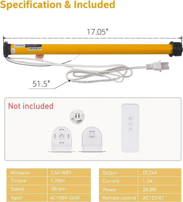 : This is an AC roller motor, powered by AC110V-240V. It requires a wall socket and is non-rechargeable, needing to be continuously connected to a power source, eliminating the hassle of recharging. false: This is an AC motor with strong power, providing 1.2N m of torque. It can support a shade weight of up to 12 lbs and easily lift shades with a width of up to 130 inches. false: Built-in WiFi control eliminates the need for a hub, directly connecting the motor to your router (note: 2.4G WiFi required). It allows for app control, including scheduled operations within the app. Supports voice control via Alexa and Google Assistant. It also has a built-in 433Mhz control system, including a 1-channel controller (multi-channel controller sold separately). Both WiFi and controller control can be used simultaneously. false-: This is a roller shade motor, primarily used to upgrade your manual roller blinds, zebra blinds, and Roman blinds to electric ones, which can be electric controlled, voice commands, or an app.