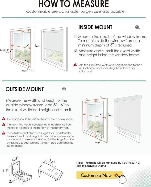 - Made-to-OrderOur smart roller window shades are customized, you will see a "Customize Now" button on the top right. Then please follow the guide to place the order. We will send an email to all customers to double confirm the size in 24 hours, please attention to the email the day after your order. And other special sizes you can contact us via message