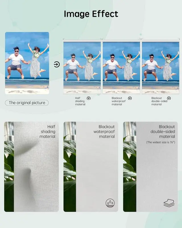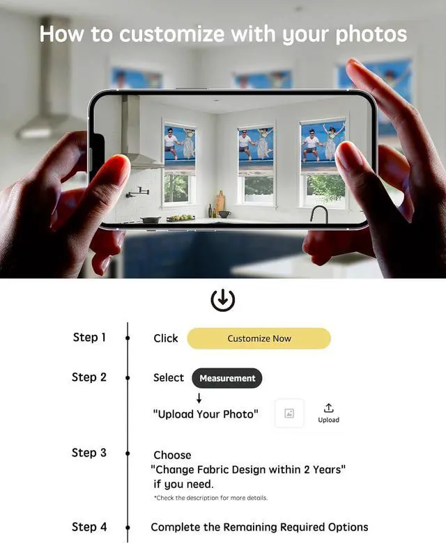 And other special sizes you can contact us via messagefalse- Custom Your Own ShadePersonalize smart blinds by uploading your own photo! With just a simple upload, we can print your custom design on the smart roller shades using eco-friendly, non-toxic pigments. Whether youre adding a personal touch to your living room, bedroom, or office, these custom roller window shades instantly transform any space with your unique prints