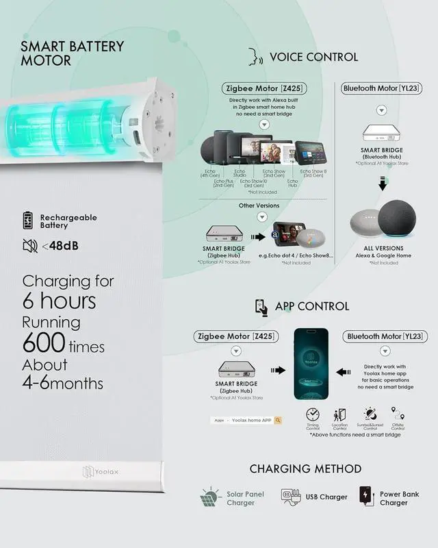 Alexa: Echo Plus 2nd Gen, Echo Show 2nd Gen, Echo Studio, Echo Show 10, Echo 4th Gen, Echo Show 8 3rd Gen, Echo Hub. No Smart Hub is needed. Bluetooth motor can directly work with Yoolax Home App without Smart Hub. Built-in rechargeable battery motor, the shades can be used for 4-6 months once fully charged. Save even more energy by purchasing solar panels to charge your roller shades