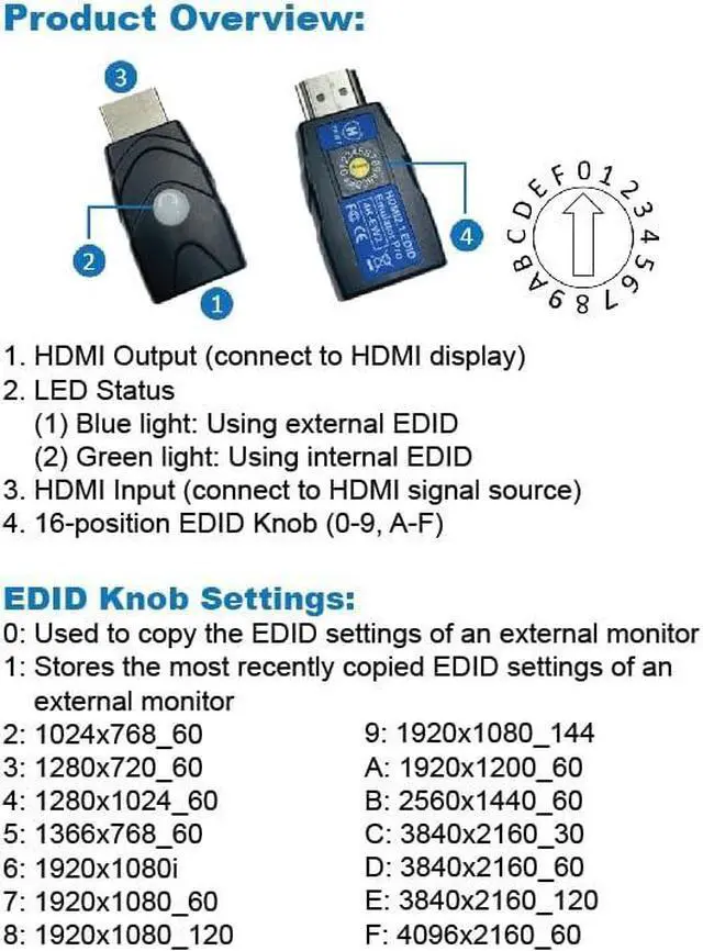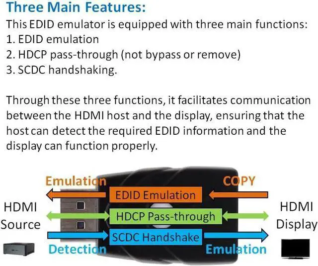 Bi-Directional Design: It can automatically detect the direction of HDMI (Sink and Source auto detection), supporting both forward and reverse connections, allowing the choice to connect the EDID emulator on the computer or display side, offering more convenient installation and application options. Headless operation supported; no monitor connection needed; even if the display is turned off. Powered by the HDMI source device; no external power supply needed. If the monitor's EDID can't be copied, please try another monitor, good HDMI cable or use internal EDID for testing. If EDID COPY function not work, please try another monitor. - Precise Matching and Easy to