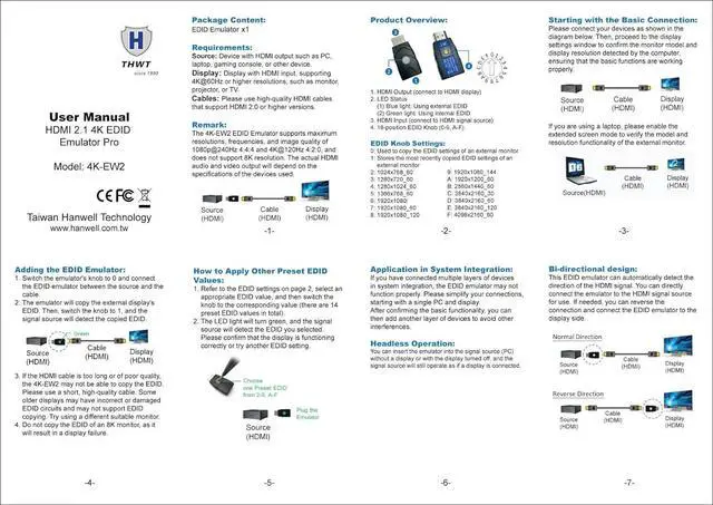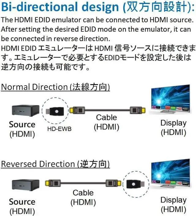 - Bi-Directional Design: It can automatically detect the direction of HDMI (Sink and Source auto detection), supporting both forward and reverse connections, allowing the choice to connect the EDID emulator on the computer or display side, offering more convenient installation and application options.