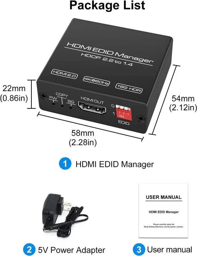 Easy to install-The 4K EDID emulator support plug-and-play, no software or driver required. pure hardware architecture, no loss of HDMI signals. Low power consumption design, support 7x24 hours of work. falseWe have a professional team to provide technical support for you, can provide professional advice for you to set up the system. Within one year, we will replace the new product for you at no charge. false- The HDMI EDID manager is a product that solves the problem of EDID incompatibility between multiple HDMI devices, and has the function of copying and saving the EDID data of the end display device and 8 types of preset EDID data.