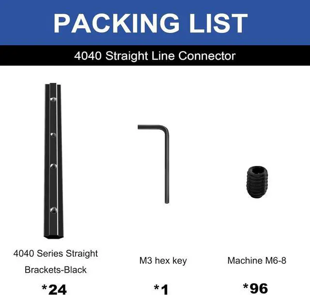 - Package Include: 24pcs 4040 Staight Connector Corner Bracket Joint Black, Screws x96pcs, Wrench x1pcs
