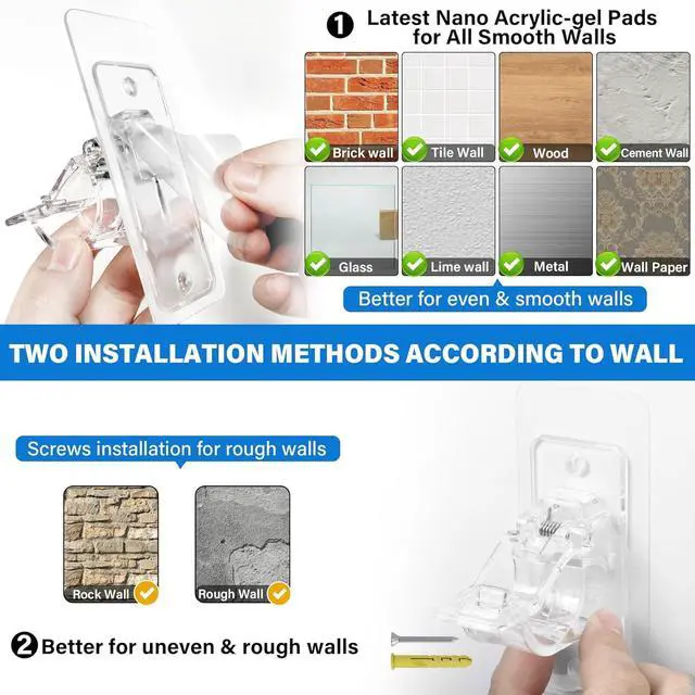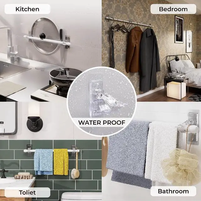 Multi-Use Brackets with Versatile Transparency for Diverse Décor Styles- Ultra Stick Instant Bonding design does not require curing stage. The transparent design makes these self adhesive curtain rod holders almost invisible matches with any home decor and atmosphere utility of living room, bathroom, kitchen, shower, bedroom, college dorm, garage, RV, apartment, good performance in both indoor and outdoor. In addition, you can also hang small accessories such as hats, umbrellas, and towelsfalseAfter-Sales Service- Should you have any questions, feel free to reach out. We guarantee a resolution within 24 hours and value your appraisal to improve our servicesfalse- No Wall Damage and Suitable for most curtain rods or towel rods with Diameter ranging from 0.5 '' to 1.18 ''.