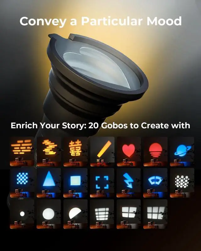 Photography Flashlight: Featuring 4-color LED beads (sunset orange, blue, white, and red), with a maximum power of 10W, CRI Ra96, TLCI98, 1, 570lux@ 0.5 m/ 5600K, to meet various shooting requirements. Equipped with 20 light filters, it supports a variety of atmospheric projection effects, for more creative possibilities