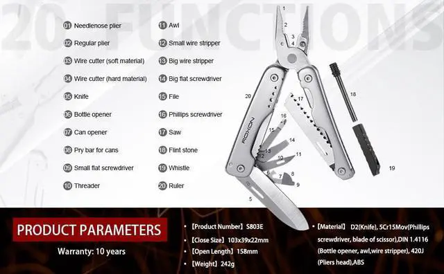Elite Version: better materials and more functions like D2 steel for the full-size lockable blades; Big flat screwdriver and Wire stripper.