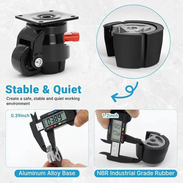 Versatile deployment includes heavy machinery, medical equipment, CNC machines, lab desks, pool tables, and moreideal for workshops, factories, commercial kitchens, and DIY projects- Heavy-Duty Leveling CastersEngineered with a one-piece cast metal frame ( 5.5 mm average thickness) and reinforced by an AISI 1045 steel axle, these leveling casters withstand extreme loads up to 2200 lbs. The dual-layer base combines lightweight yet durable aluminum alloy with NBR industrial rubber padding, ensuring stability even under demanding industrial or commercial use