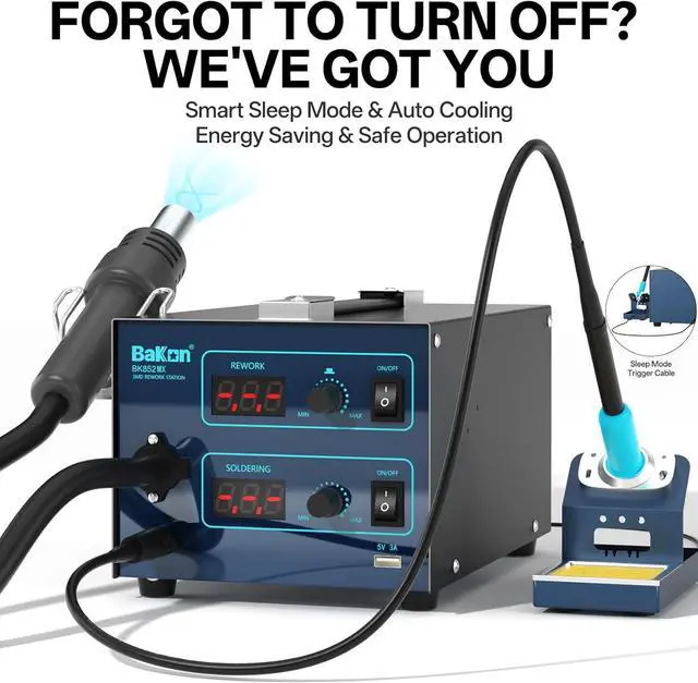 - Smart Sleep Mode & Auto Cooling System: To enhance safety and energy efficiency, the BAKON 852MX C210 Hot Air Soldering Station includes an automatic sleep mode that activates when idle, reducing power consumption and extending the lifespan of the heating elements. The auto cooling system ensures the station cools down quickly after use, providing added safety and convenience.