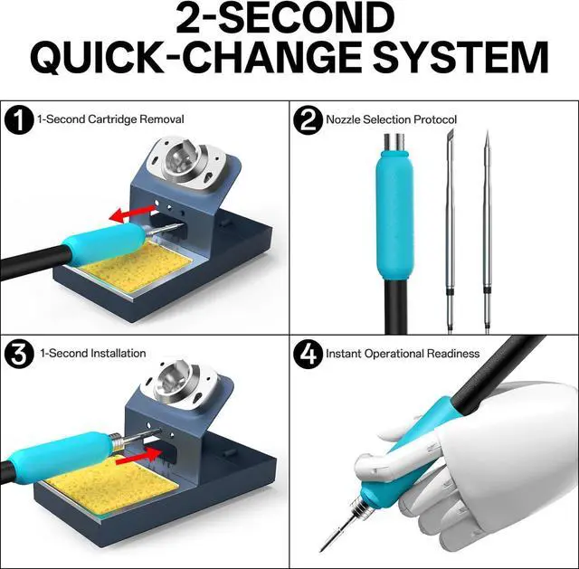 - Interchangeable Heating Elements & Adaptive Technology: The rework station adopts plug-and-play heating cores, making replacement quick and hassle-free. The soldering iron handle features adaptive heating technology, automatically adjusting to different heating cores for optimal performance in various scenarios, ensuring versatility and ease of use.