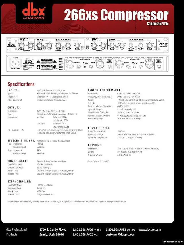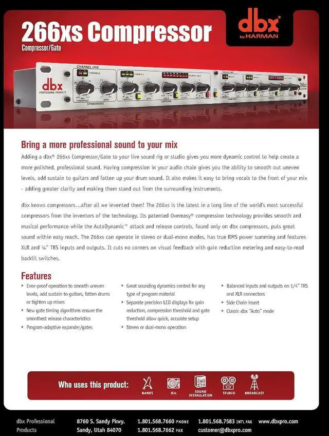 - Professional Performance - The dbx 266xs audio compressor utilizes patented Overeasy compression technology and AutoDynamic attack and release controls, providing smooth, musical performance for both studio and live applications.
