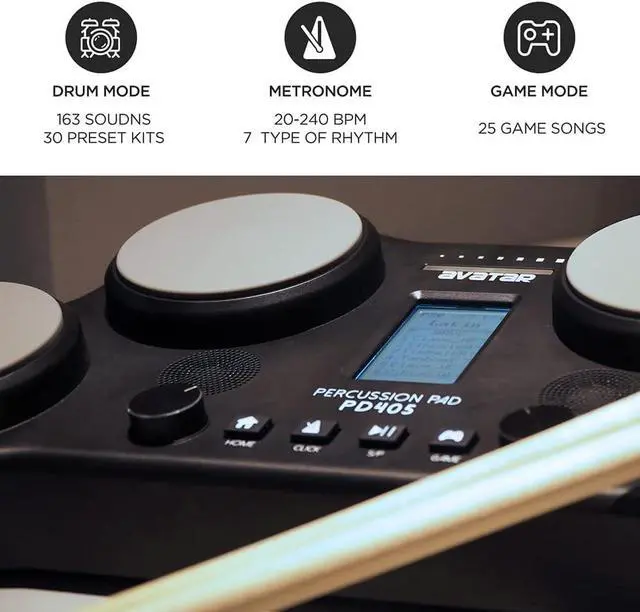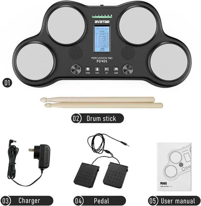 With Built-in Speakers, Play Out Of Box - Just plug the power cord, or insert 6 pcs AA batteries, then youre ready to rock. Perfect for young school band, outdoor party or travel playing. falseEnjoy Music, No Disturbing - With dedicated headphone jack, PD405 keeps private practice simple. Plug a set of headphone, then you're in your music world. false- PD405 Percussion Pad - 4 silicone pads offer vivid dynamic with velocity sensitivity. 2 digital pedals ensure full foot control. It's ultra-portable all-in-one digital drum set.