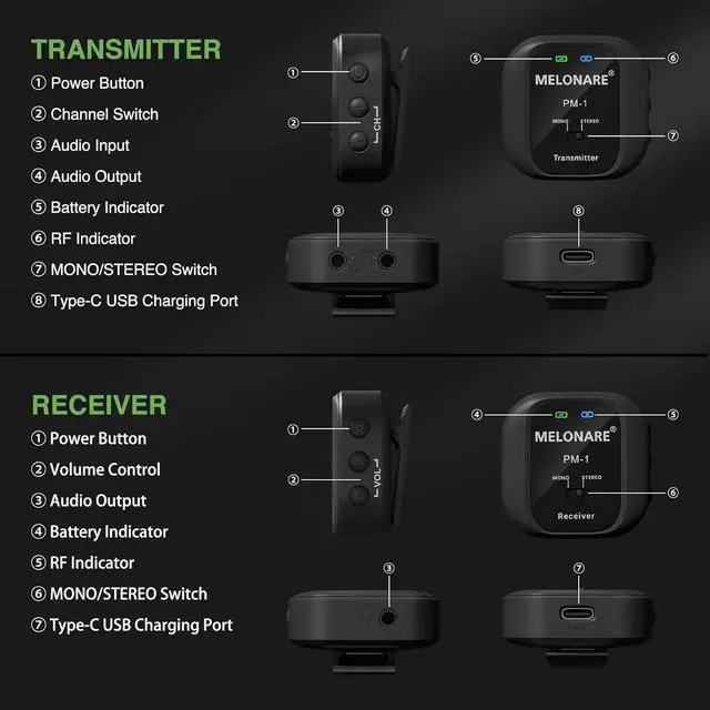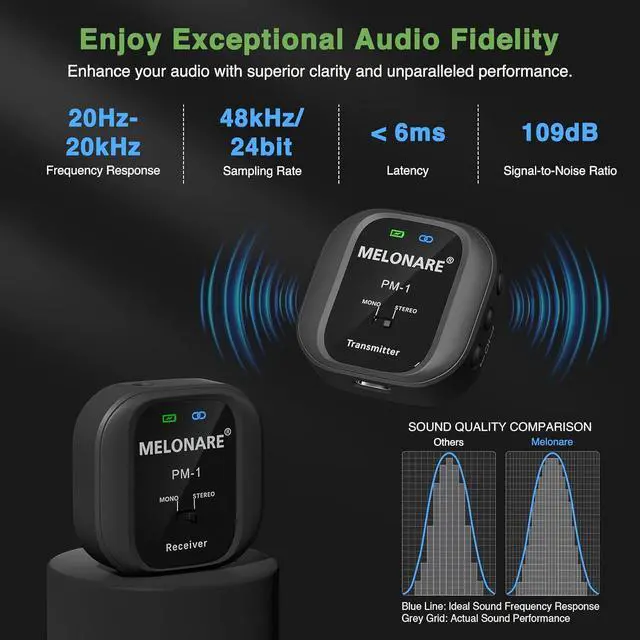 Extended Battery Life: Our IEM system features a 400mAh rechargeable battery with up to 5 hours of use and an intuitive battery indicator: green (100%-75%), yellow (74%-50%), orange (49%-25%), and red (24%-1%). The compact clip-on design that maintains portability while ensuring your performance is flawless. Latency is less than 6 ms, 24-bit/48kHz sampling rate, 20Hz-20kHz frequency response range, and 109 dB signal-to-noise ratioOne-to-Many