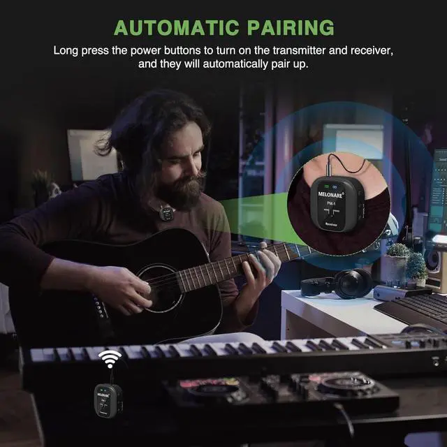 - Automatic Pairing: This wireless in-ear monitoring system pairs automatically, eliminating the need to select a channel. Long press the power buttons to turn on the transmitter and receiver, and they will automatically pair up, with the RF indicator glowing blue, ensuring you're ready to perform without any complicated setup