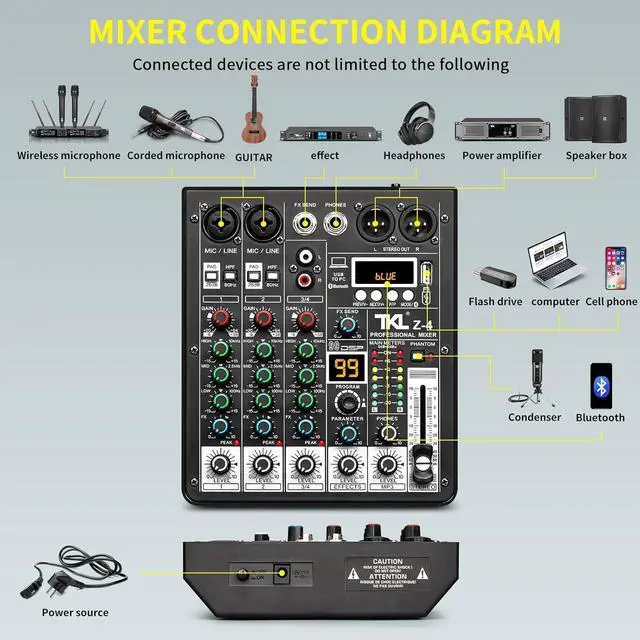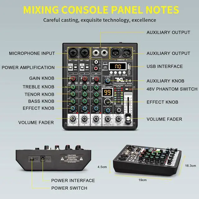 Stereo and Microphone Line Inputs This 4 channel mixer comes with two XLR line input connectors for microphone connections, supporting both balanced and unbalanced signal inputs, and offers 3-band equalization adjustments for precise sound controlfalse99 DSP Reverb Effects The Z4 audio mixer boasts 99 digital signal processing effects, including reverb and delay, which can be finely adjusted and optimized to enhance your audio qualityfalse- +48V Phantom Power The audio mixer is equipped with a 48V phantom power switch, enabling it to power professional condenser microphones that require a 48V supply to ensure optimal microphone performance