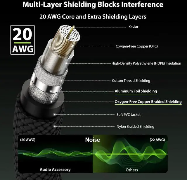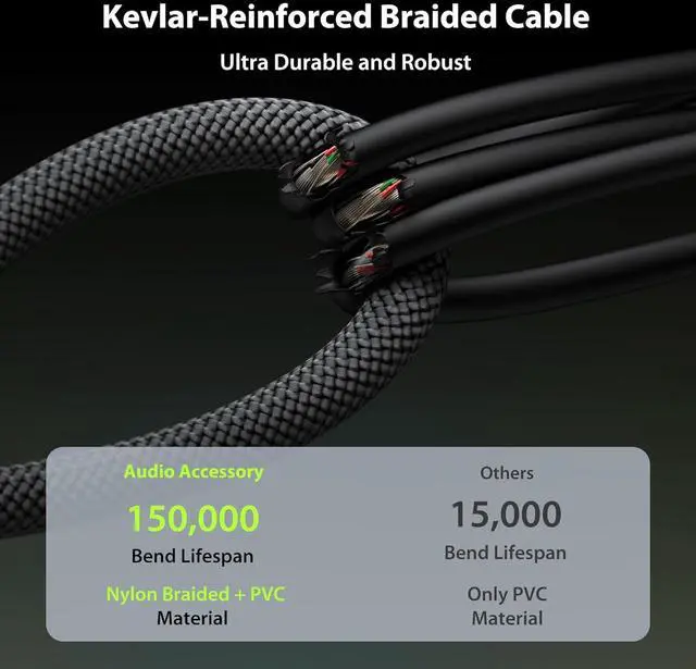 We include an extra layer of OFC braided copper shielding, providing superior protection against interference from surrounding equipment and power sources. Whether in the studio or on stage, this ensures clear, noise-free audio transmission, delivering better recording and performance quality in complex environments. - [Kevlar-Reinforced Braided Guitar Cable] AA AUDIO ACCESSORY is the first brand to introduce Kevlar into audio cables. This greatly improves the durability of guitar cable, makes it withstand heavy pressure and relocations during your tour. It can withstand over 150, 000 bends, which is 10 times higher than other guitar cord without Kevlar.