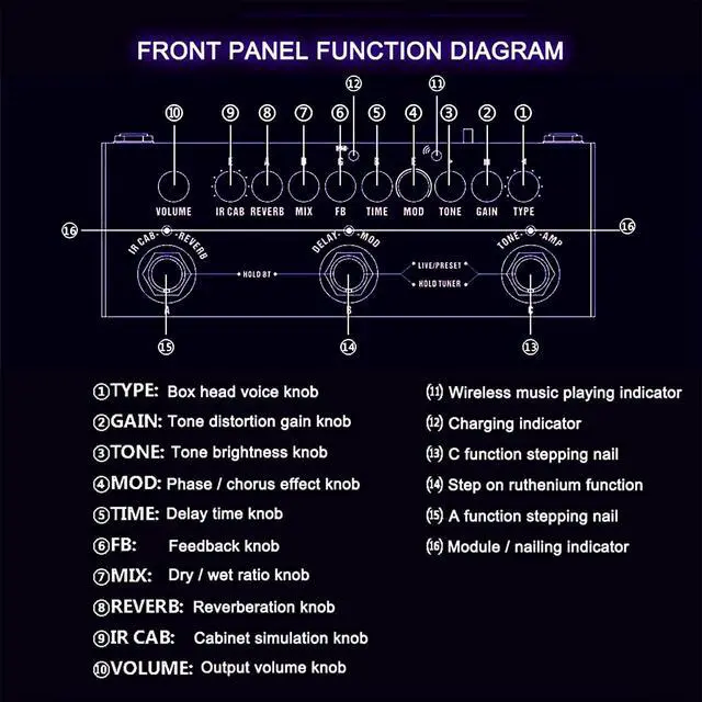 - Multi-FunctionThe guitar effect pedal designed with wireless music playback which can play accompaniment conveniently in your show. The function of the pedal also includes sound card and mobile phone recording function. Easy to carry and excellent tone. Your good guitar companion!