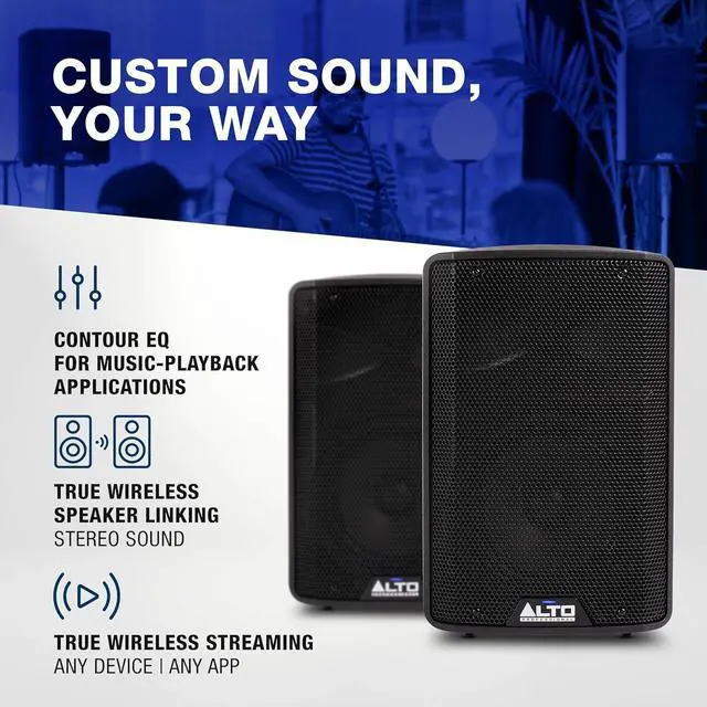 Bluetooth True Wireless Stereo (TWS) - Cable-free audio streaming lets you easily connect your devices for immersive, rich stereo sound in any setup, whether taking a break or jammingfalsePro-Grade Performance - Built-in 2-channel mixer for microphone, line level and Bluetooth inputs; Mix output for linking multiple speakers; contour EQ for music-playback; integrated 36mm pole socketfalseThe most compact in the Alto Professional TX Series, the TX408 is not to be underestimated-this PA speaker delivers clear, robust sound and is the all-purpose solution for any live band or DJ looking for on-stage sound monitoring.