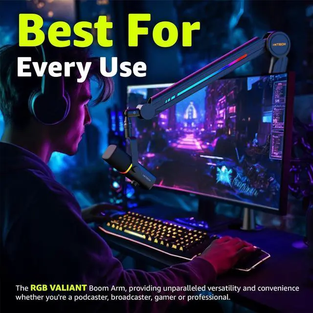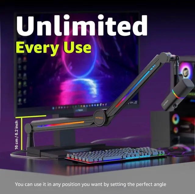 - Keep your Space Organized: We designed the desk mic arm with built-in cable management to help keep your space tidy and organized. Whether youre recording, singing, podcasting, or streaming, our microphone boom arm with RGB will make sure you can speak, sing, and record comfortab
