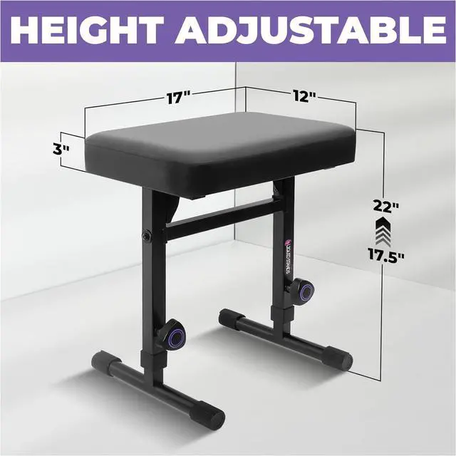 - Adjustable height: This bench adjusts in 1 inch increments to account for different heights and play styles. Whether youre using this as a piano stool or a wide keyboard bench, you can ensure youre at the proper height.