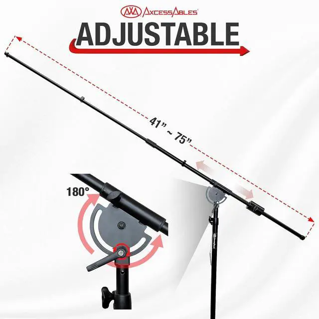 - Adjustable Height & Boom: The stand adjusts from 3ft 9" (47-inches) to 6ft 7" ( 80.5 -inches), while the boom extends from 2ft 6" ( 30.5 -inches) to 5ft 6" ( 65.5 -inches). Ideal for various applications, including film production, music recording, and as an overhead microphone stand.