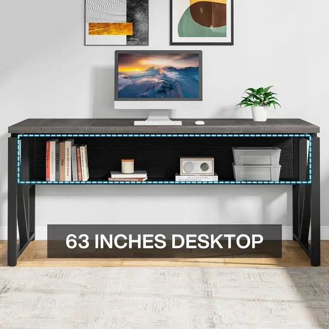 - Large 63 computer tableThe large 63" X 31" x 30 (L *W*H) desk top big enough for your laptop, second monitor, a lamp, and some writing space to spread out and get work done. A wide Storage shelf under the desktop, provide extra space for your books or office stuf