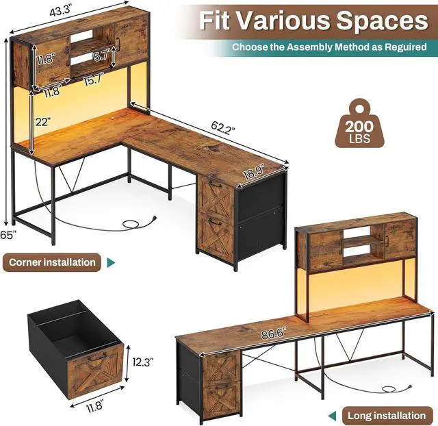 - Reversible DeskReversible 62.2 -inch corner desk or 86.6 -inch long office desk. A L-shaped desk is perfect for a corner, it can hold your computer, monitor, books, and files for the home office. An 86.6 -inch two-person desk can hold two-person studying or writing no interference. The top hutch can be placed left or right for your needs.