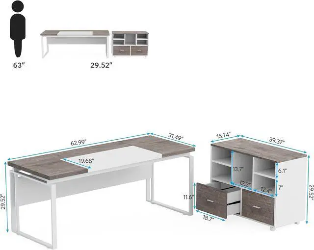 - Ample Storage Space This 63" desk and 39.4" file cabinet set offers great storage options to keep your office organized. The file cabinet is equipped with 2 drawers, perfect for hanging letter-sized files, along with 5 open shelves to showcase your essentials or decorations.