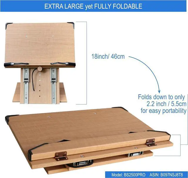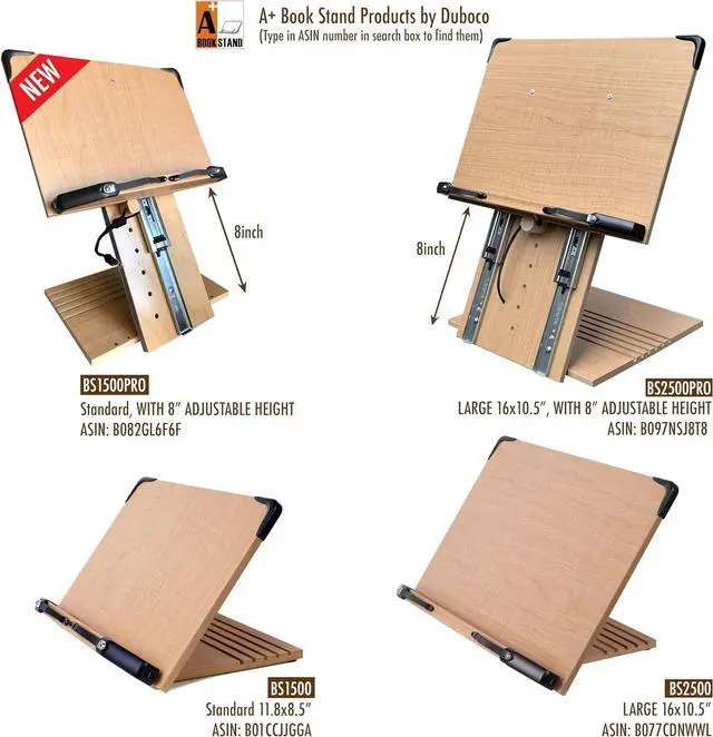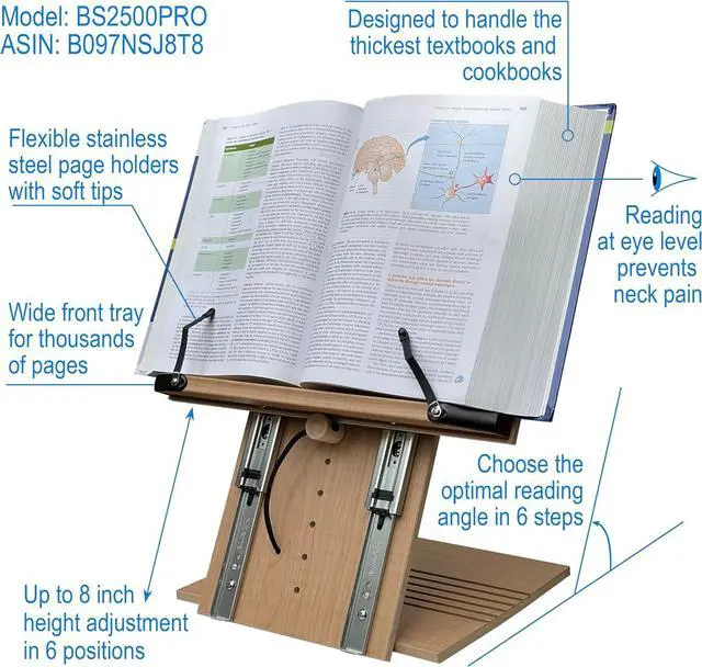 FLEXIBLE AND STRONG PAGE HOLDERS with EXTRA WIDE FRONT TRAY ( 1.6" ) - keep the thickest book wide open with strong and flexible page holders - Bookstand corners are protected with plastic reinforcements for added durability. false ERGONOMIC EYE LEVEL SETUP - 2 massive, lubricated Stainless Steel Slider allows for easy and seamless height adjustments to EYE LEVEL. Top edge reaches massive 20inches above deskopfalse- PATENT PENDING - BOOK STAND BS2500PRO WITH 8" HEIGHT ADJUSTMENT - Easily adjustable height and angle allow for setting the book to perfect eye-Level