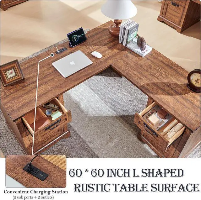 - RedLemon computer l desk will create an extremely efficient and comfortable work area. It can help ensure that everything you need is within easy reach during a busy day! 60" x 60" generous tabletop surface provides room for all your must-have office essentials laptop, notebooks, decor, and your favorite coffee mug. A convenient AC power to make charging electronics a breeze. 3 standard drawers to store your paper pads, notebooks, calculator, and other things you want close at hand.