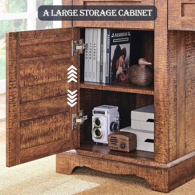 Grandeur Farmhouse L-Shaped Executive Desk: The classic double pedestal design gives this home office desk a heavy-duty and grandiose look while a fluent linear border on drawer faces, and hand-rubbed burnished hardware, provide sophisticated architectural detailing. Also, warm antique finishes are wonderfully easy on the eyes and it has natural variations in color, and texture, giving every piece a unique look, and adding a touch of a homey and rustic farmhouse aesthetic.