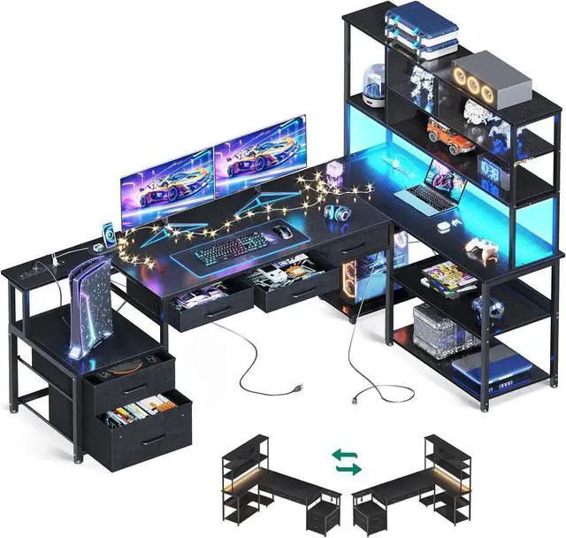 Adjustable non-slip foot pads ensure not only protect your floor from being scratched, but also ensure stability on uneven ground. Easy Assembly & After-Sale ServiceThe AODK office desk come with detailed instructions, all parts are clearly labeled, what you need to do is following instructions step-by-step. If your AODK computer desk arrives damaged, missing part or scratched, please feel free to contact us, our professional customer support team will help you solve the problem within 24 hours. - What You getAODK L-shaped desk provides 1 led light, 2 power outlets, 4 Tier open shelfs, 5 fabric drawers and CPU stand.